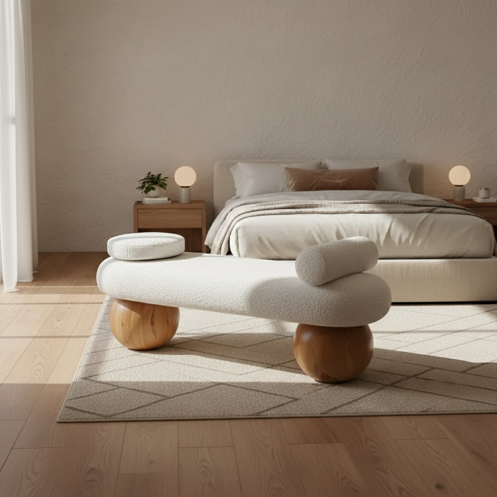 Handcrafted wooden balls featuring premium quality solid wood with a lustrous polish finish, upholstered in luxurious top-grade boucle fabric for refined elegance. Fully customizable in size and color to match your unique aesthetic preferences and interior design requirements.
